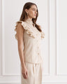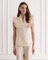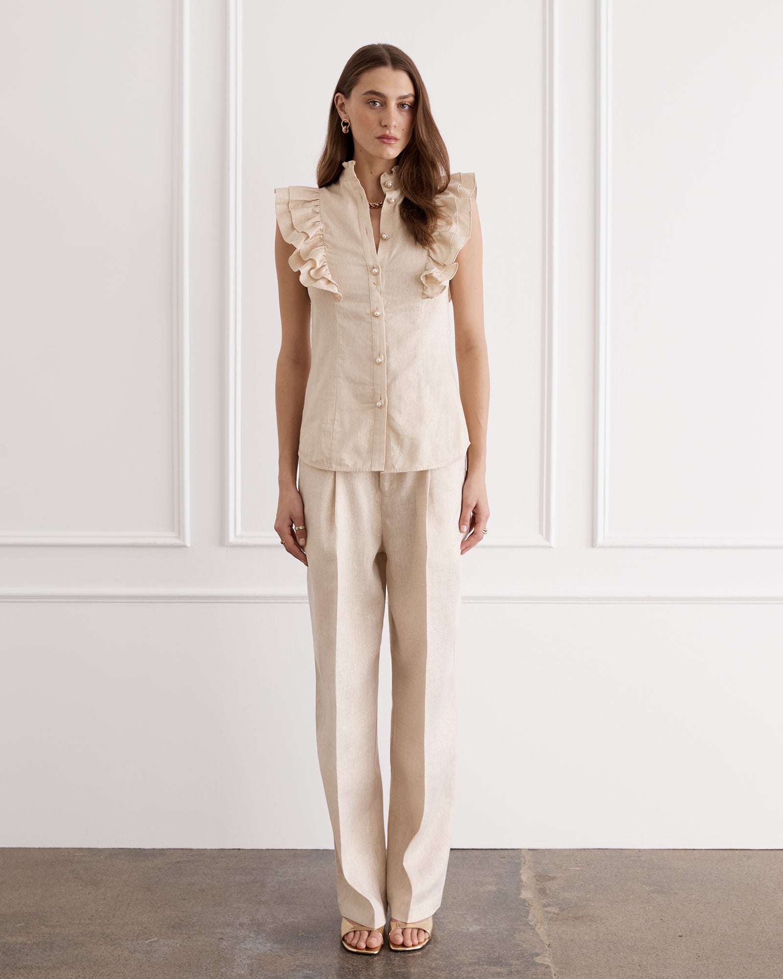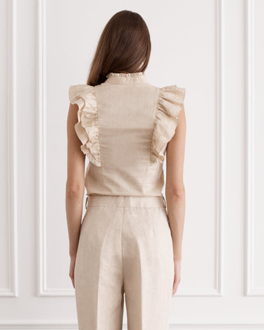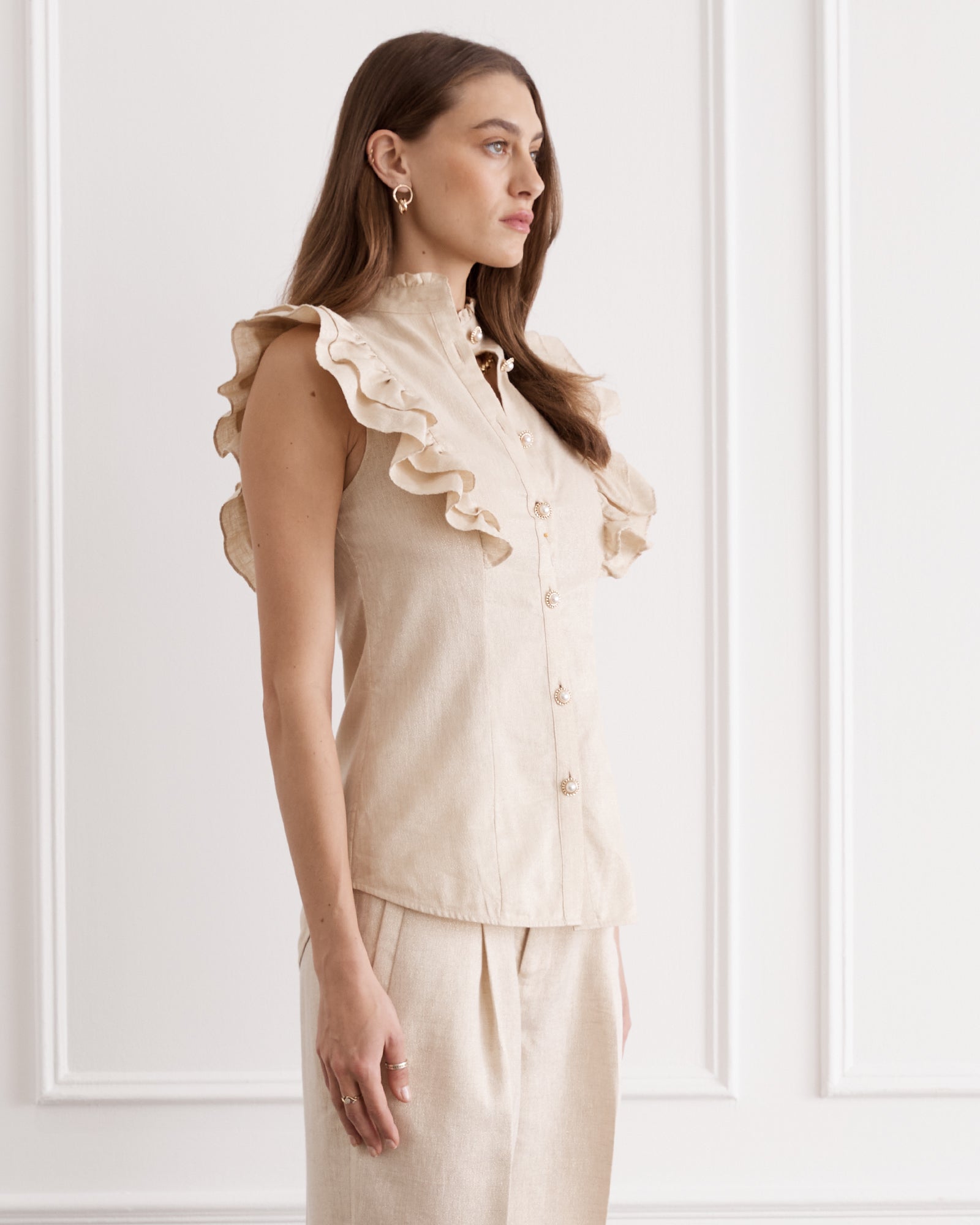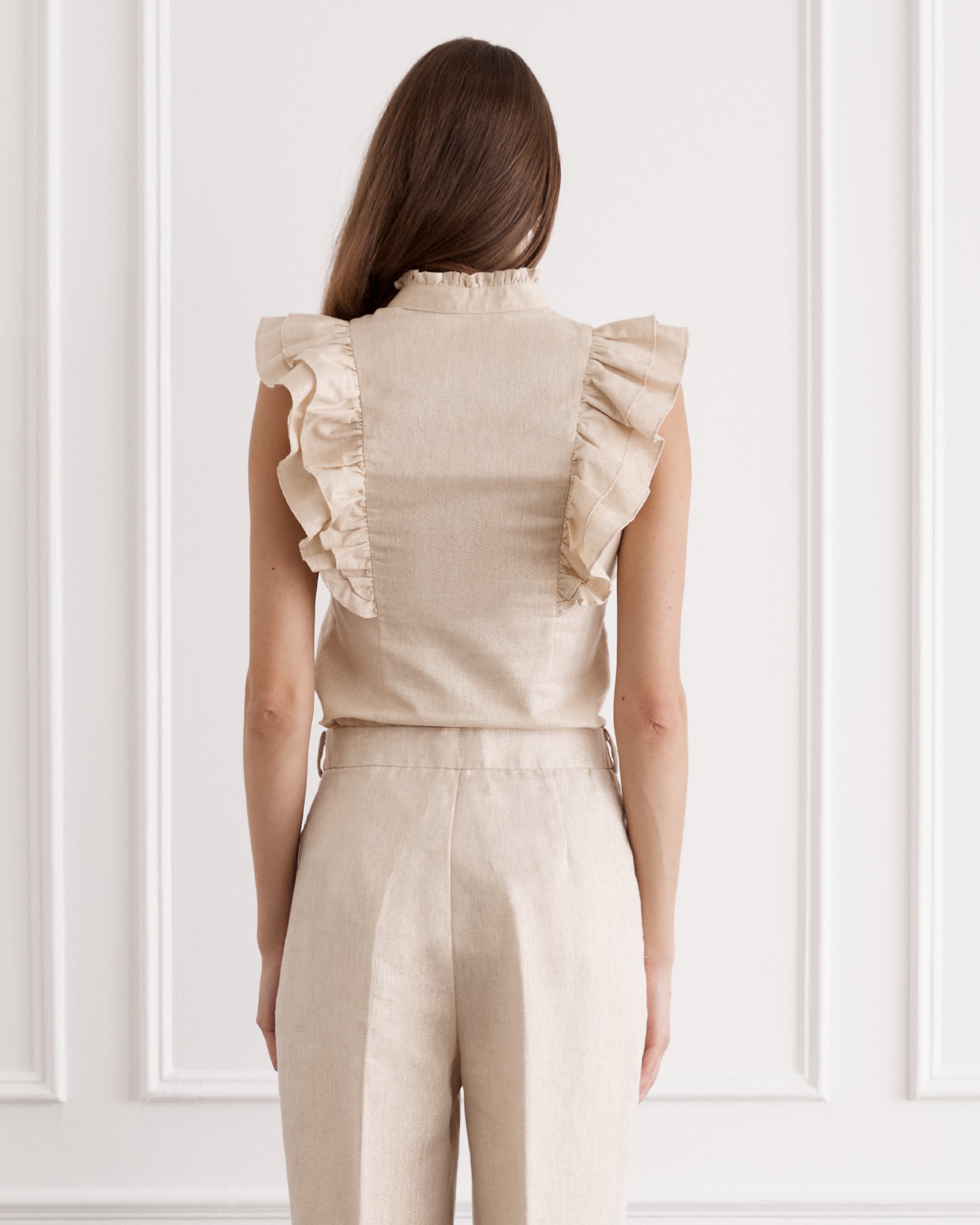 The Aubrey Top adds a bold statement to trans-seasonal outfitting. Woven from the strength of French Flax Linen and the fluidity of gold metallic thread that captures light with every movement, allowing it to hold both structure and softness. Pleated ruffle sleeve detailing meets a form-fitting silhouette, a harmonious blend of romance and sophistication.