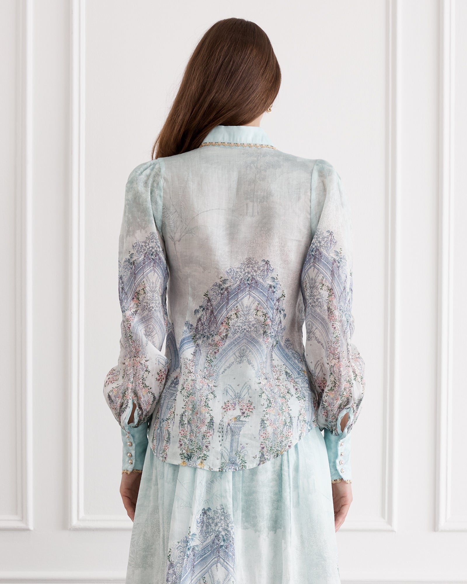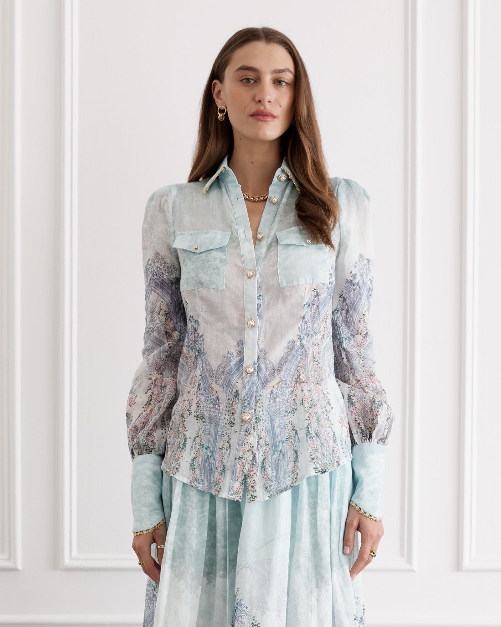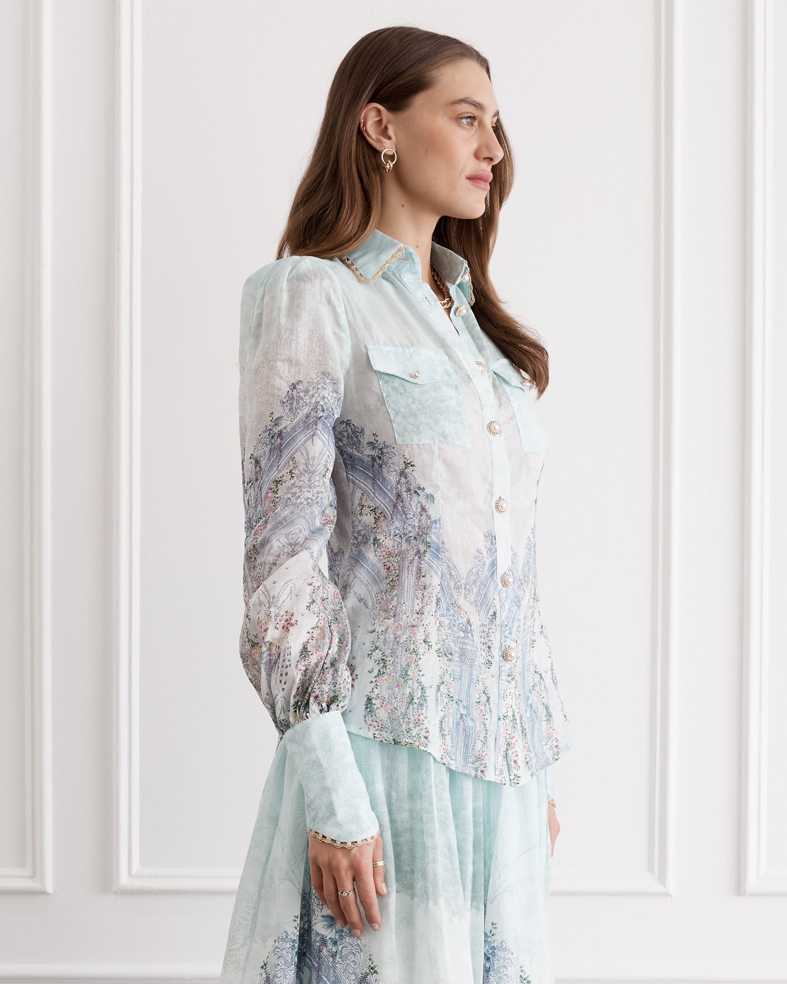 The Sasha Blouse is a symphony of glamour and sophistication. Woven from the strength and fluidity of 100% French Flax Linen, allowing it to hold both structure and softness. Artful blouson sleeves meet a structured gauntlet cuff, finding a perfect balance of detail and form.