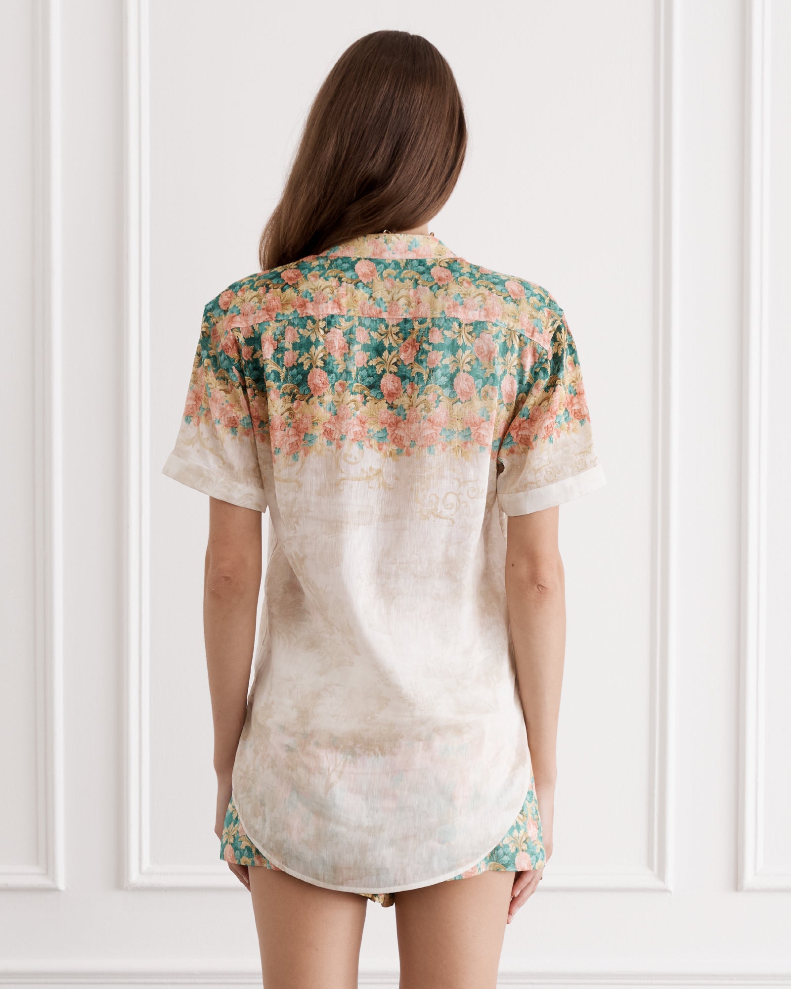 The Taylor Shirt adds a bold statement to trans-seasonal outfitting. Woven from the strength of French Linen and the decadent fluidity of Mulberry Silk, allowing it to hold both structure and softness. A mandarin collar meets a form-fitting silhouette, a harmonious blend of romance and sophistication.
