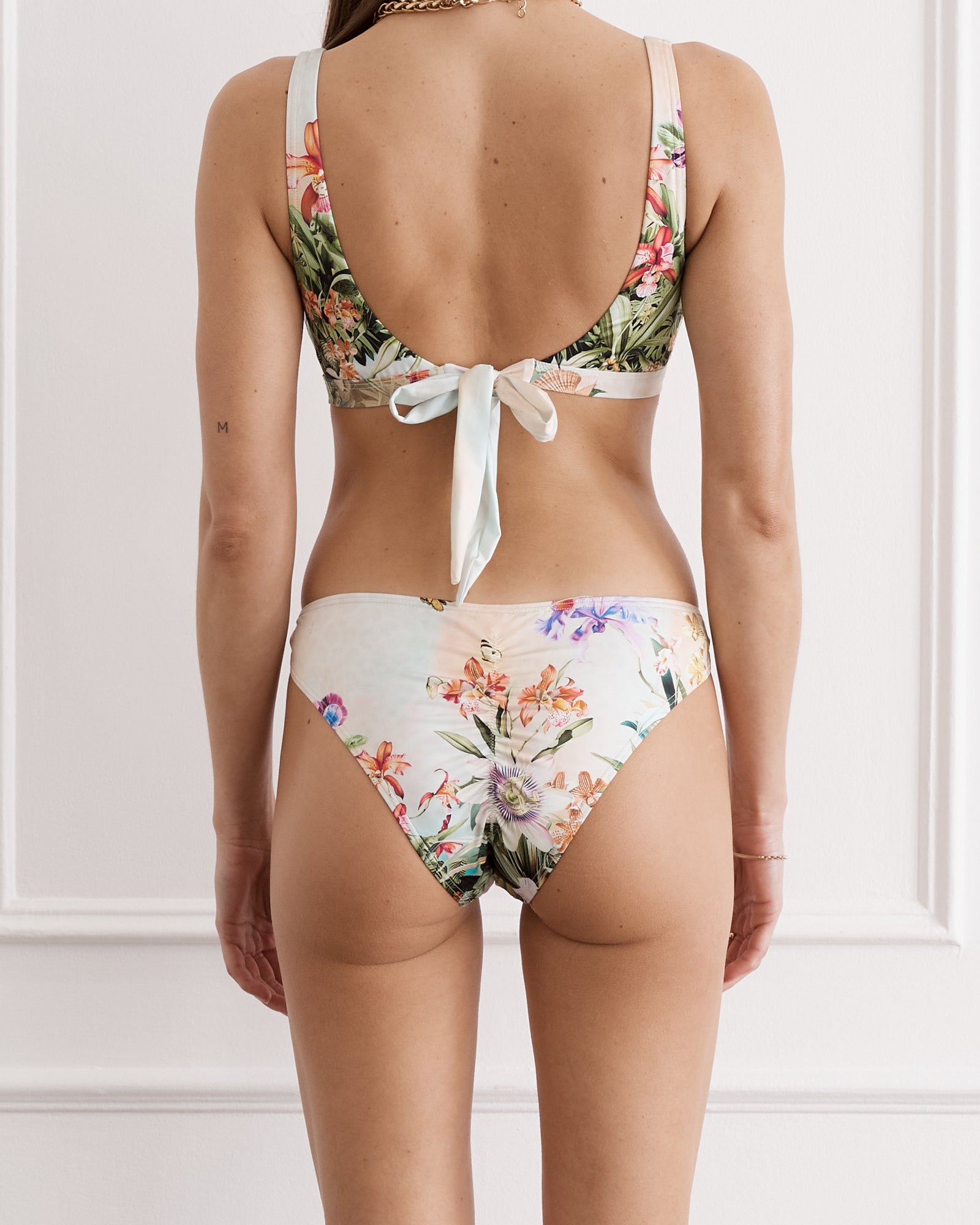 The Joy Cheeky Pant - where form meets function. Crafted in our decadent Fritillaire print with custom gold hardware and ruched detailing at the centre back. A contoured leg-line offers a sculpted silhouette.