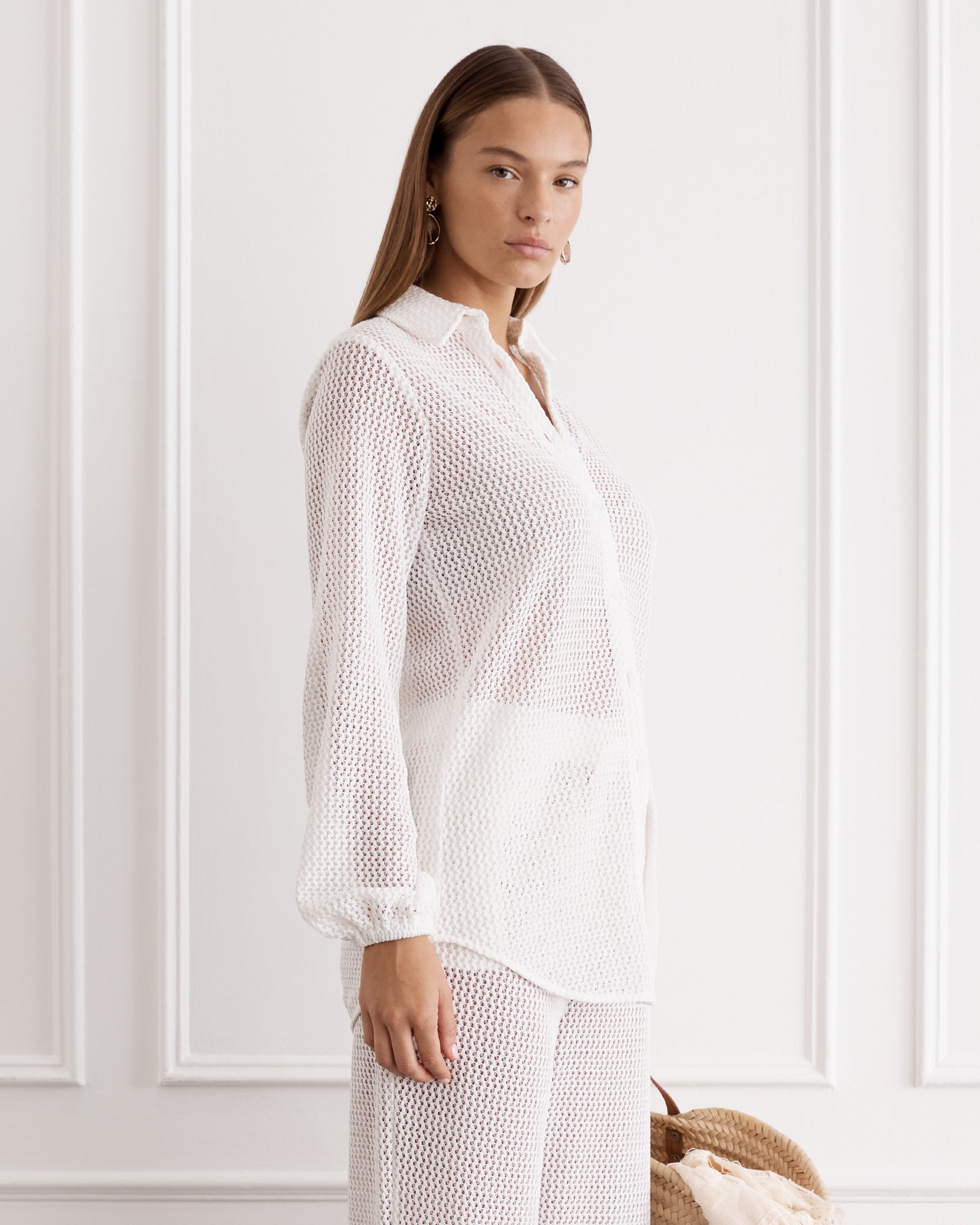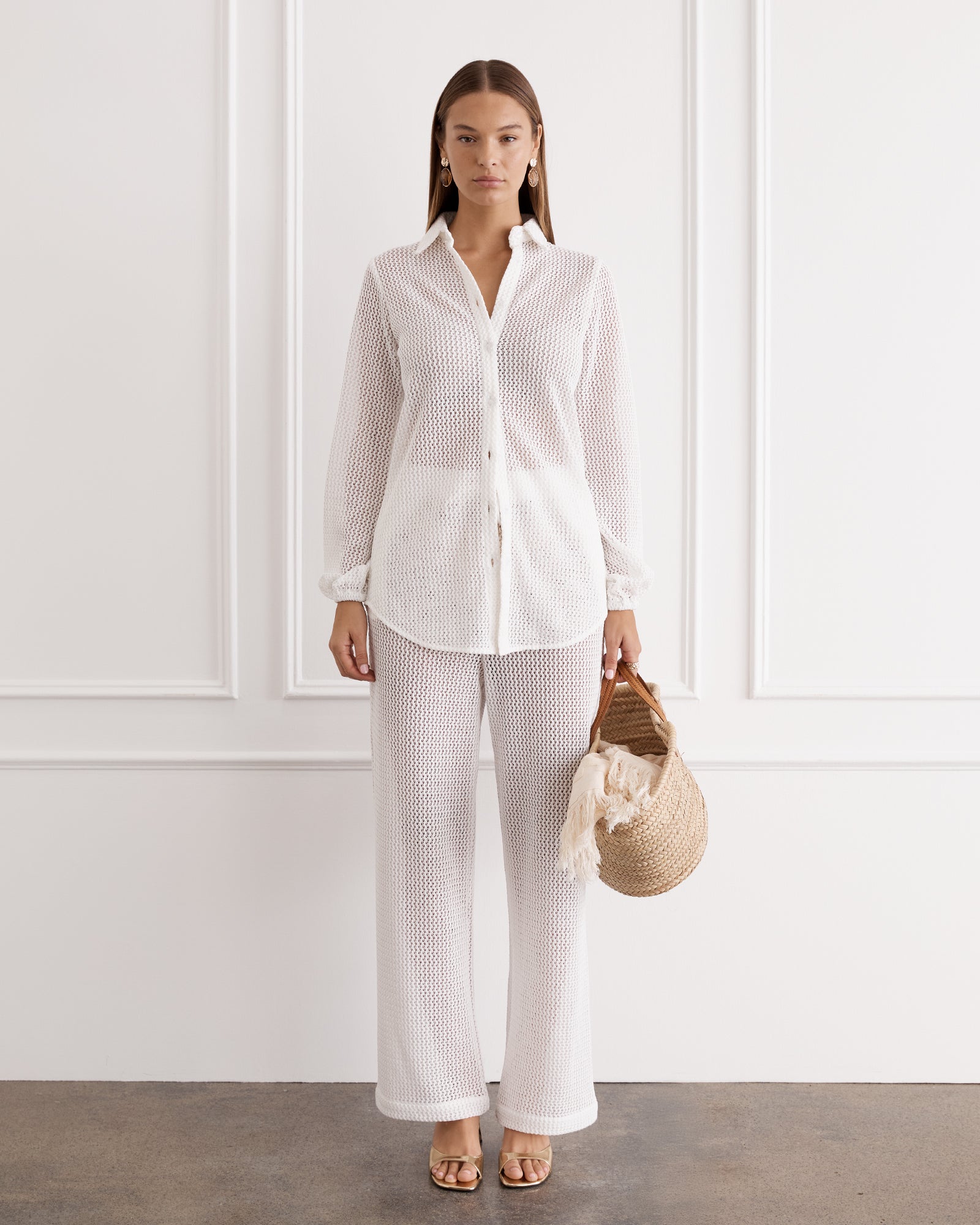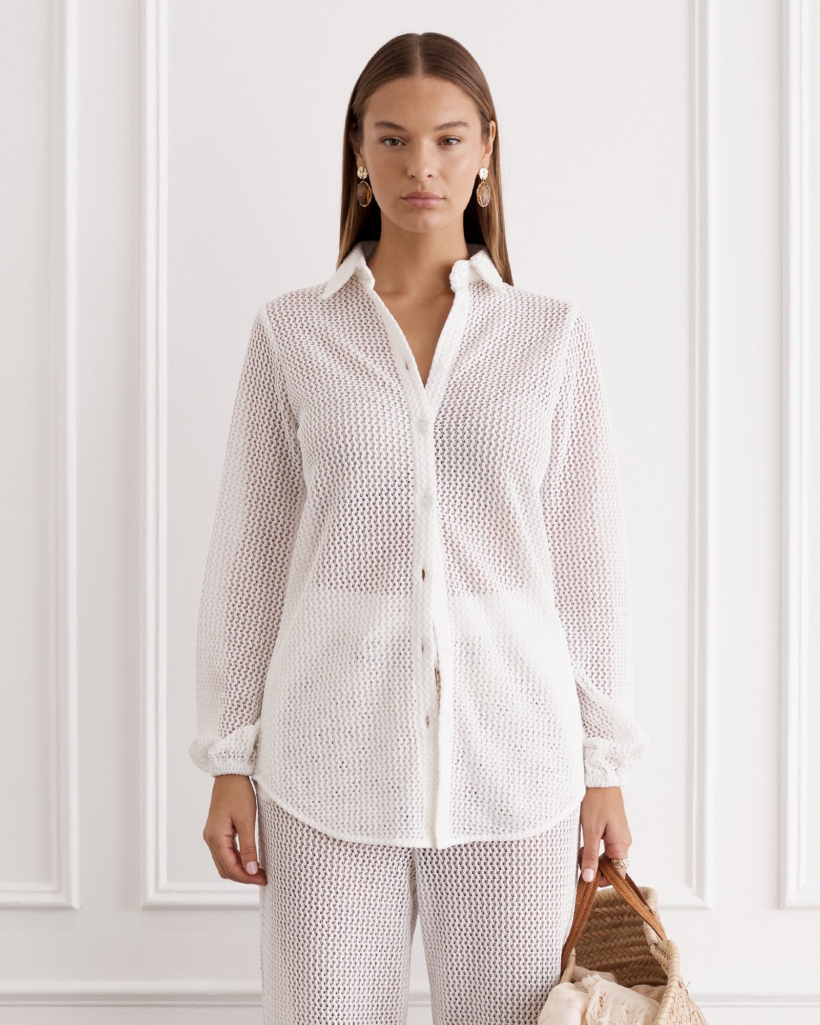 The Odilia Beach Shirt redefines resort wear staples. Crafted from a light yet decadent sheer knit that gently skims the body, for a relaxed and effortless silhouette. An elasticated cuff adds structure to softness, a beach-to-bar essential.