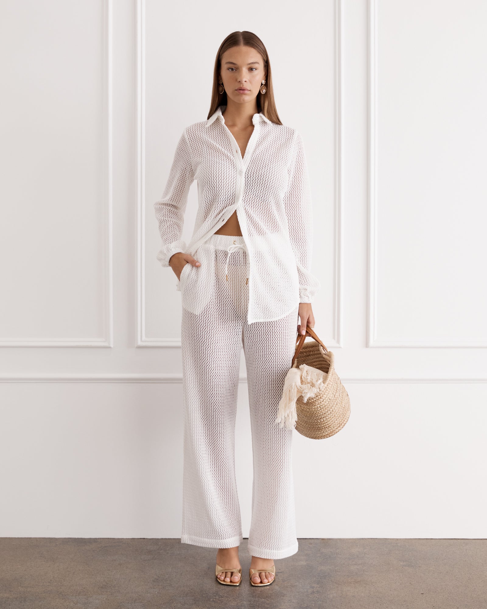 The Resort Pants redefine resort wear staples. Crafted from a light yet decadent sheer knit that gently skims the body, for a relaxed and effortless silhouette. A drawstring at the waist adds structure to softness, a beach-to-bar essential.