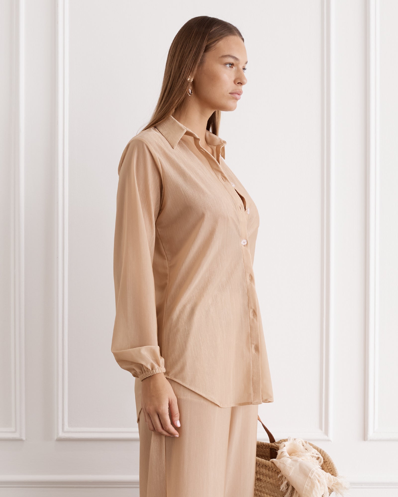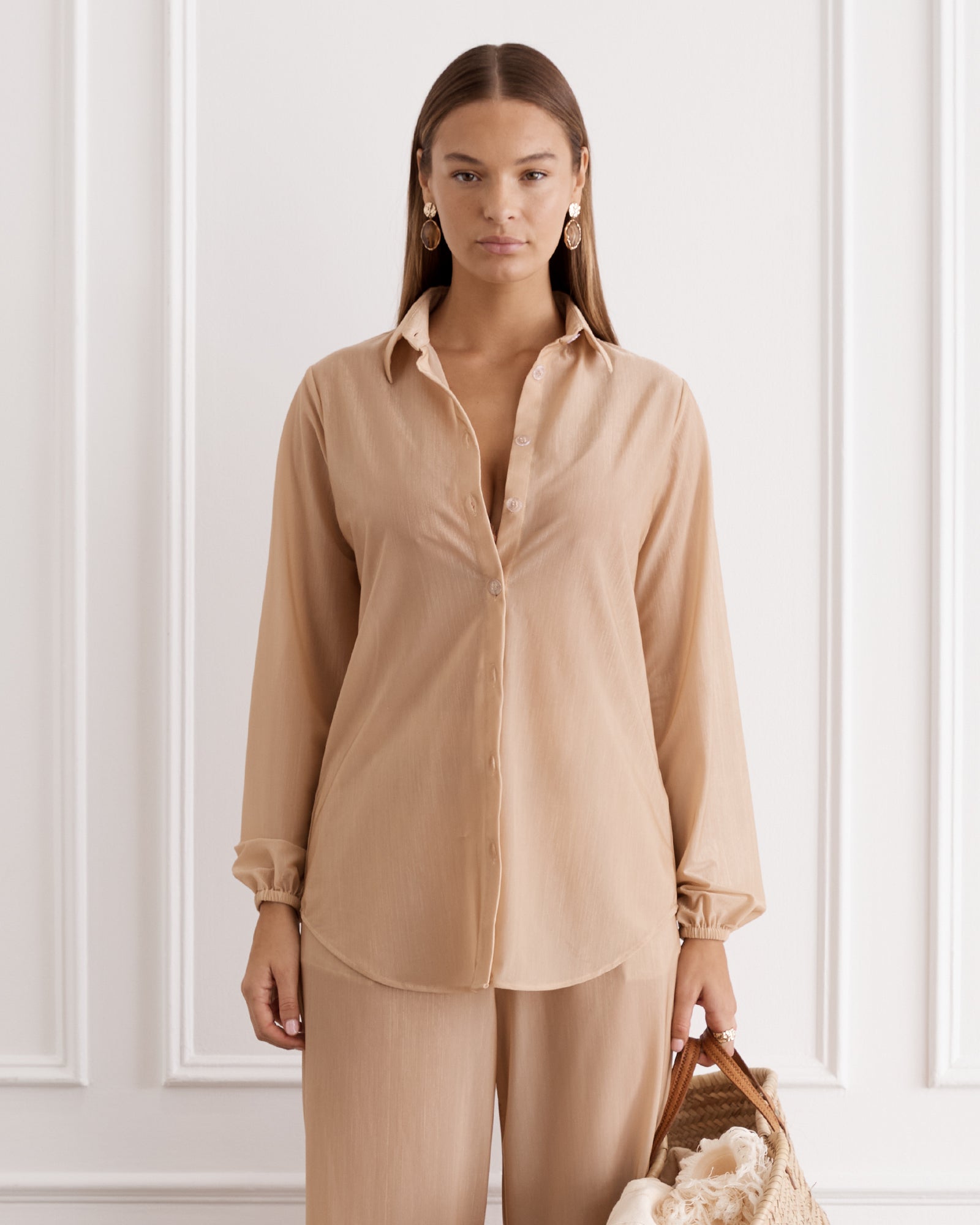 The Odilia Beach Shirt redefines resort wear staples. Crafted from a light yet decadent sheer knit that gently skims the body, for a relaxed and effortless silhouette. An elasticated cuff adds structure to softness, a beach-to-bar essential.